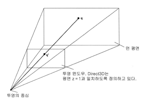 뷰 스페이스 z값을 보관하고 있는 동차 좌표계의 마지막 원소로 나누어 정규화된 투영 평면으로 투영됩니다.
